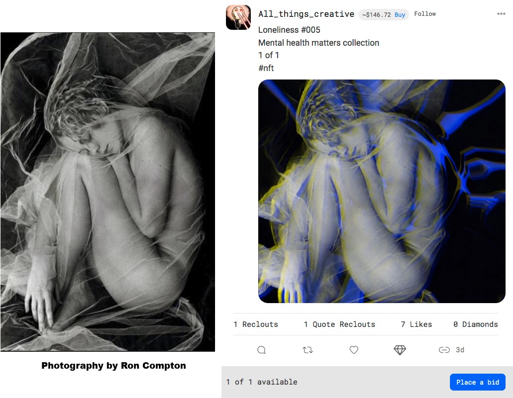 The photograph used in this NFT titled "Loneliness" is the work of American photographer Ron Compton, who specializes in dancers, portraits and nudes.