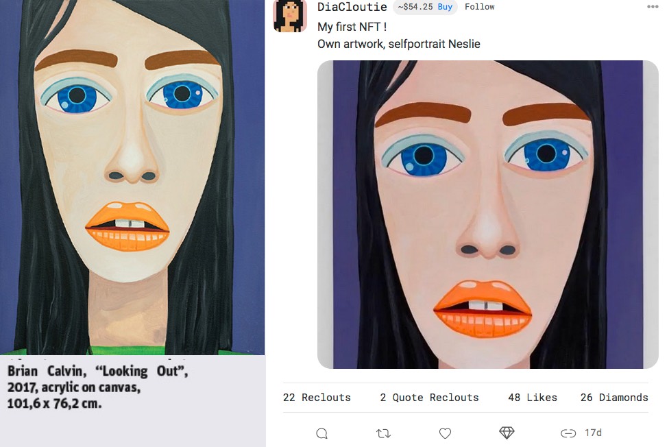 The painting used in this NFT is the work of the Californian painter Brian Calvin who is known for his stylized close-up portraits as in this typical example.